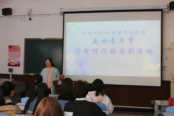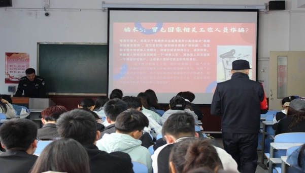 活动伊始,由自由路派出所民警同志分六个方面为同学们详细讲解有关电信诈骗的具体内容,讲述当前我国电信诈骗犯罪总体情况。民警同志就当前形势列出如下7种电诈手段:贷款诈骗类,兼职刷单诈骗类,消除虚假征信诈骗类,冒充诈骗类,网络交友投资(杀猪盘)诈骗类,冒充QQ,微信好友借款,验证账号诈骗类以及虚假购物(服务)诈骗类,并详细告知同学们相关预防手段。充分有效地增加了学生们对电诈相关知识的了解,提高了学生们的防诈能力。最后,由中国民生银行的反诈宣传员分享电信诈骗的相关视频,并通过相关案例重点详细介绍了校园贷及其危害,为学生们敲响警钟。