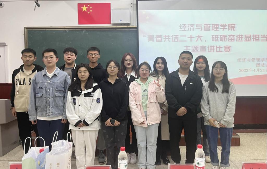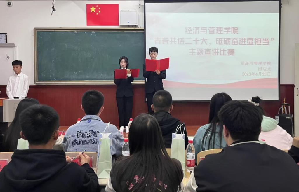 为深入学习宣传贯彻党的二十大精神,教育引导广大团员青年坚定不移听党话、跟党走,经济与管理学院团总支于4月25日晚在博楼500举办“青春共话二十大、砥砺奋进显担当”主题宣讲比赛。比赛由张静和毛佳贺主持,邀请各学院团总支副书记担任评委,我院2021、2022级部分同学参与宣讲。