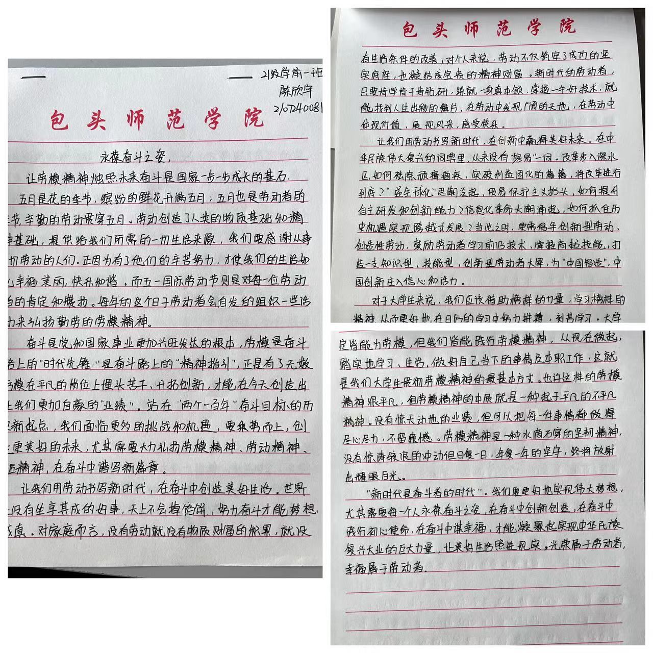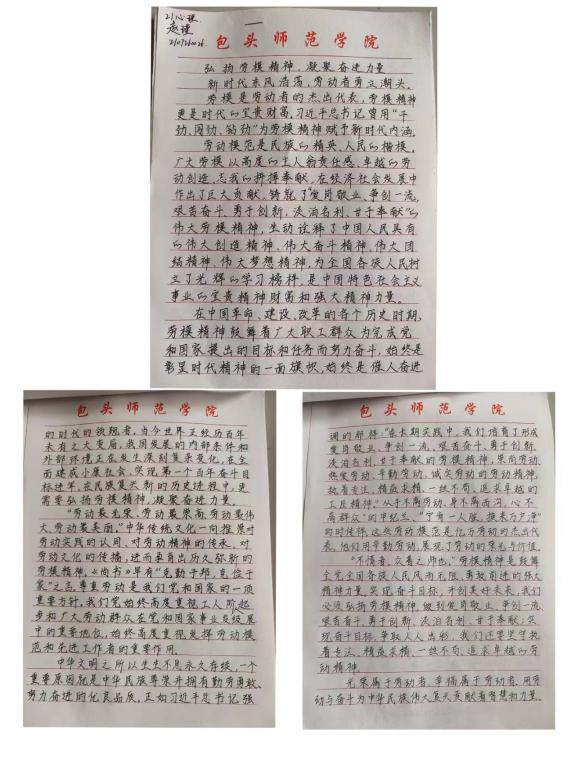 此次活动紧紧围绕弘扬爱国主义精神、感受榜样力量、争做新时代青年主题,共收到160余篇作品。同学们从不同的角度将“读”与“感”联系紧密,有的同学通过自己的双手协助爸爸妈妈做力所能及的家务,比如为家人做一顿饭、洗碗、擦桌子等等;有的同学感慨了革命先烈勇担重任的家国情怀、当代劳模鞠躬尽瘁的高尚情操和身边同学在疫情防控中的的奉献精神,并结合自身实际,联系日常所学所做所思所悟书写感悟。同学们的作品字迹工整,内容真实,格式美观。活动结束后,同学们纷纷表示在今后的学习生活中将积极践行劳模精神,成为劳动精神的弘扬者、引领者,用青春的劳动力量汇聚起伟大的“中国梦”,共同奏响“劳动最光荣”奋斗之歌,让青春在劳动中绽放绚丽之花。