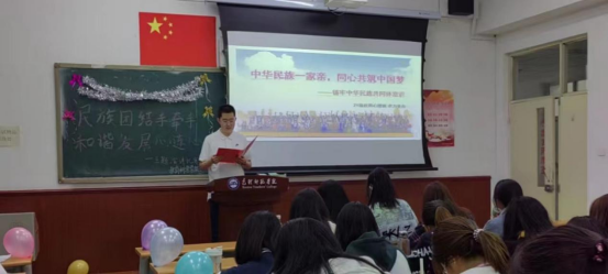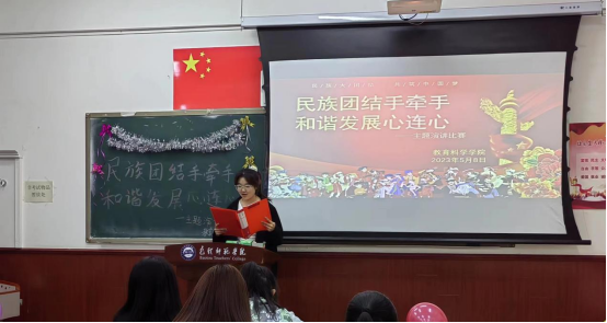 为学习贯彻习近平新时代中国特色社会主义思想主题教育,深入开展民族团结进步教育,铸牢中华民族共同体意识,引导青年学生树立正确的国家观、民族观、文化观,不断提高思想认识,教育科学学院于5月8日在博东102举办了“民族团结手牵手,和谐发展心连心”主题演讲比赛。