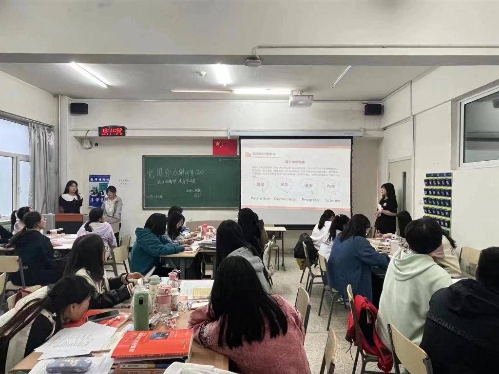 活动开始前,两位学生党员通过调查问卷了解同学们对“五四精神”的理解程度以及学习情况。针对同学们的问题,学生党员张敏、闫红带领大家共同学习了“五四精神”、“五四”运动的历史意义和时代价值以及相关知识的英文表达。就“当代青年团员如何在新时代担当责任与使命?”的问题,以团小组为单位展开讨论。大家纷纷表示要加强自身学习,以“五四精神”指引方向,以实干创造未来,在实现中华民族伟大复兴的时代洪流中踔厉奋发、勇毅前进。