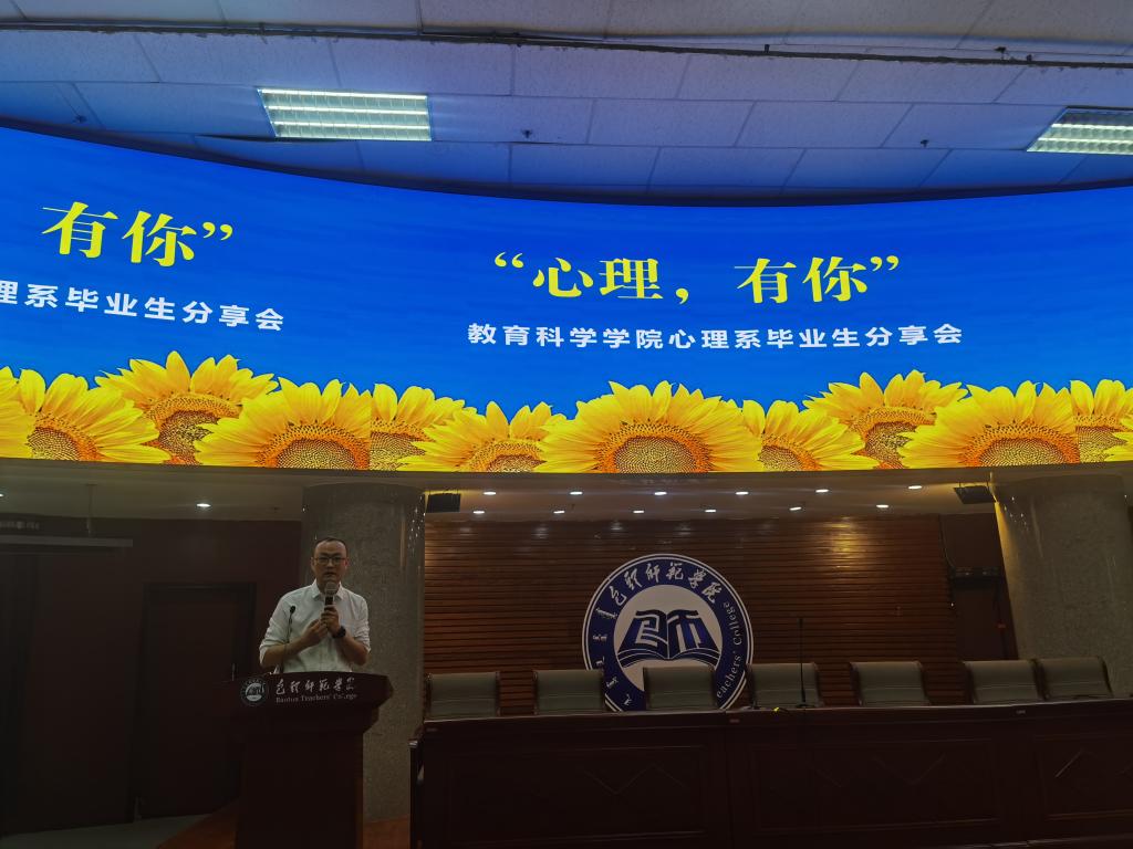 2022年6月8日晚,教育科学学院心理系在博学楼学术报告厅举办“心理,有你”毕业生分享会。18名往届毕业生、心理系全体教师及在校生参加分享会。分享会由心理系教学系主任李志强主持,教育科学学院副院长刘俊英致辞。