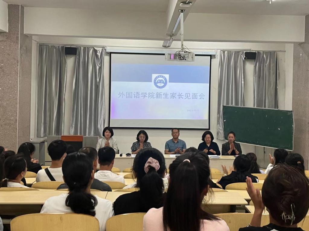 7日上午,学院召开2023级新生家长见面会。会上,外国语学院党总支书记李培欣对2023级新生家长及新生的到来表示热烈的欢迎,对家长和学生选择外国语学院表示感谢,期望家长、学生与学院同频共振,为培养新时代外语人才共同努力。院长赵阿茹娜介绍了学院发展历史、师资力量、专业课程、培养方式等相关内容,让家长们对学院有了更深入的了解。党总支副书记丁坤讲从日常管理管理和就业规划两个方面进行了分析和讲解。现场也与新生家长进行了互动。