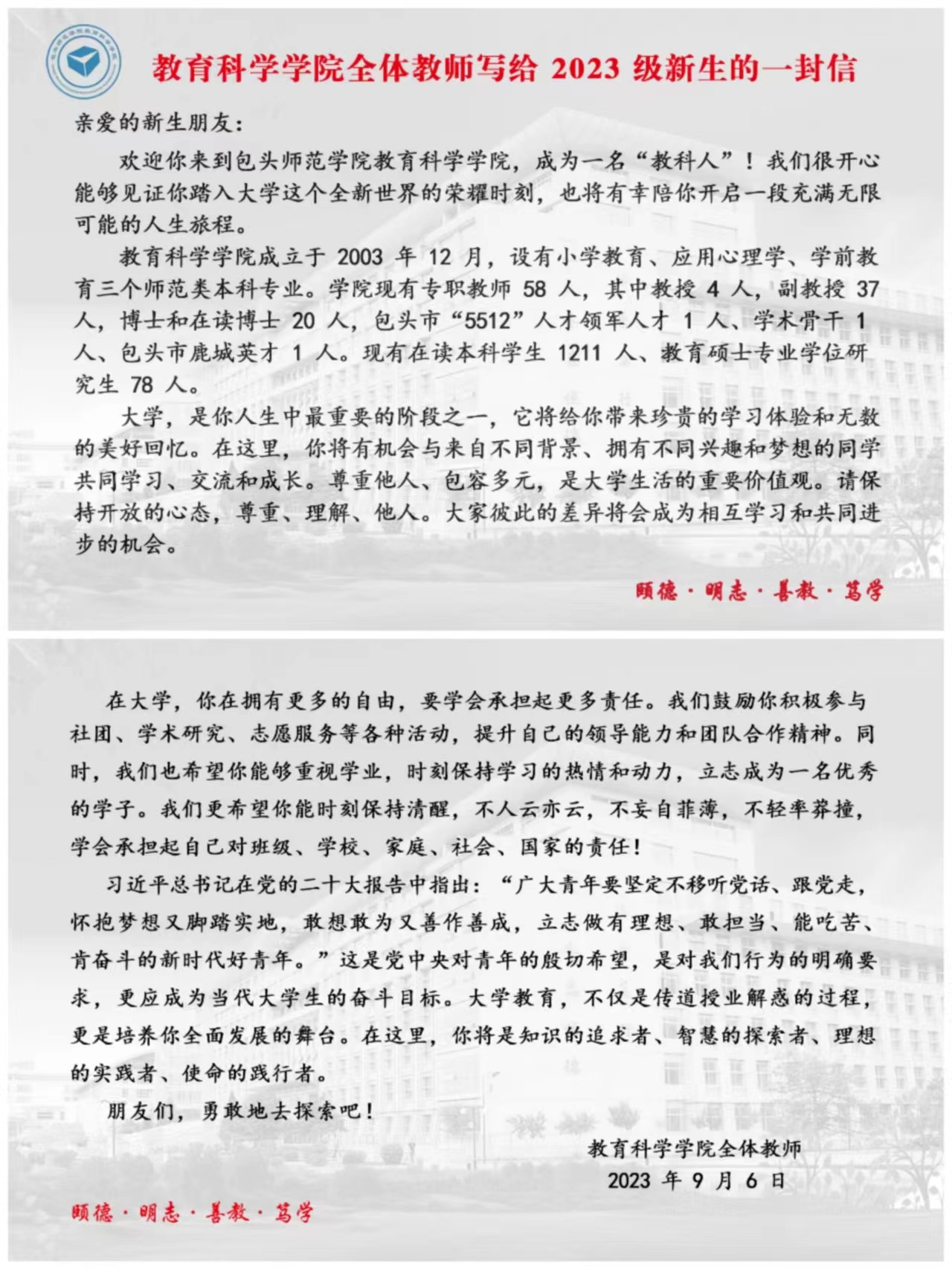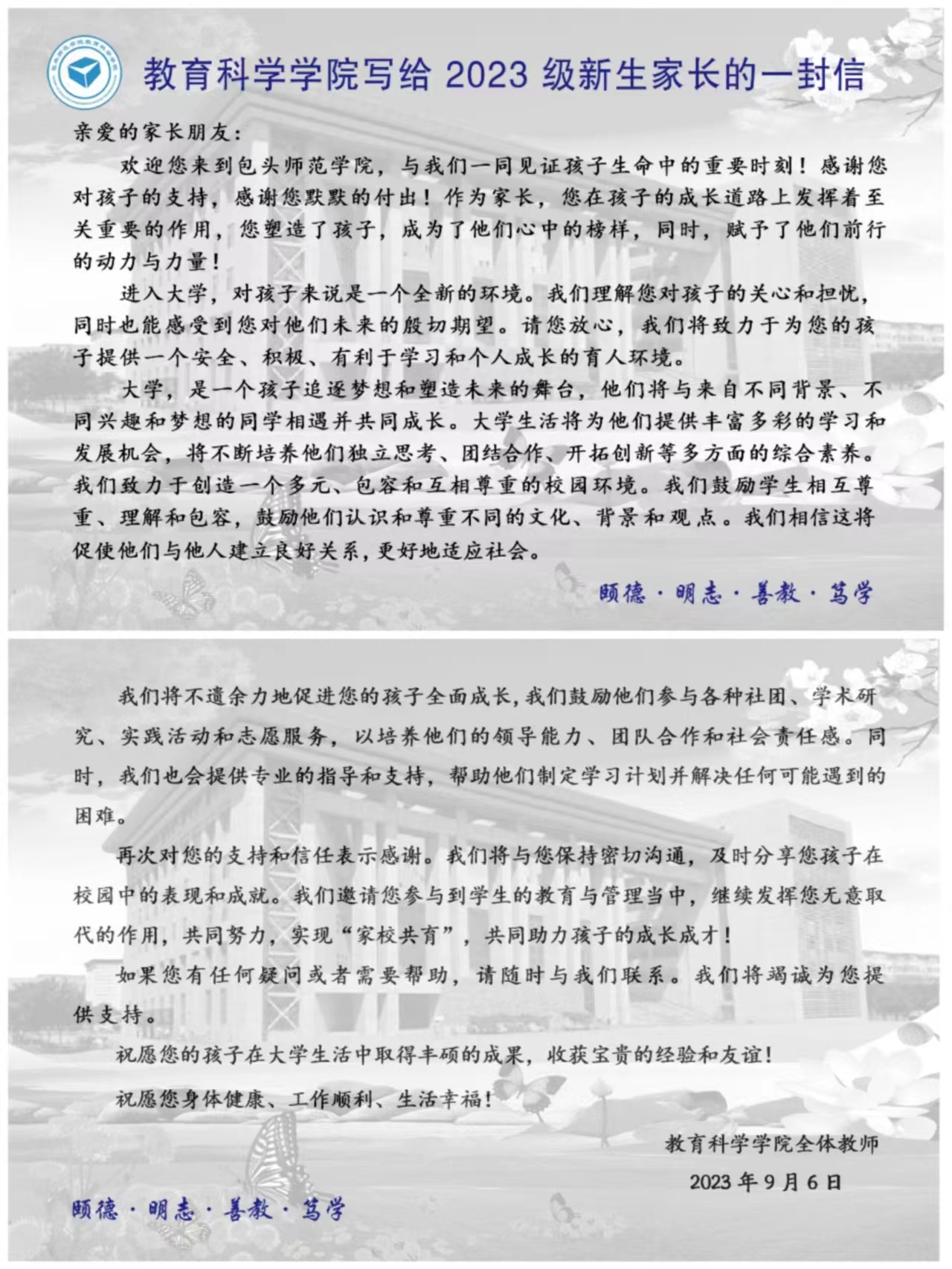 给新生和家长的一封信,是本年度教育科学学院迎新工作的新举措。给新生写信,是一次开展新生思想教育的机会;给家长写信,是学院将要逐步推进的“家校共育”机制的启动。(教育科学学院)