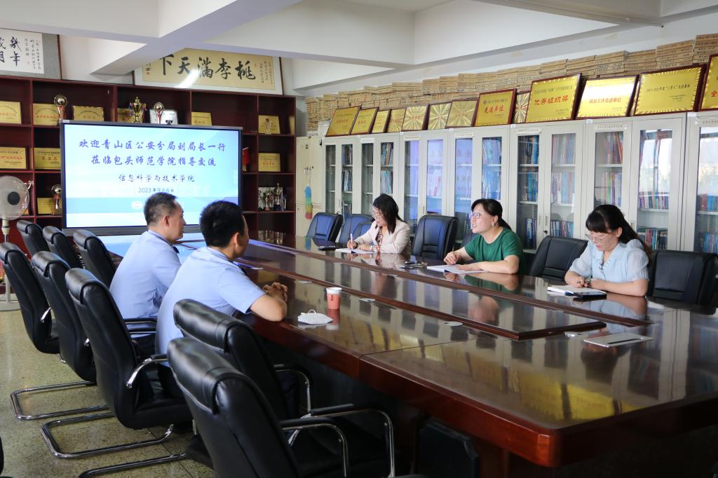 会上,院长陈静对青山区公安分局一行表示热烈的欢迎,同时详细介绍了学院专业发展以及科研建设、人才培养和师资力量等方面的基本情况。刘燕强副局长对信息学院的欢迎与支持表示感谢,希望学院和分局能够建立长期合作,同时借助学院专业优势,为分局建立基层警务信息库提供技术支持,以方便未来数据信息分类、分析,实现警务信息化。