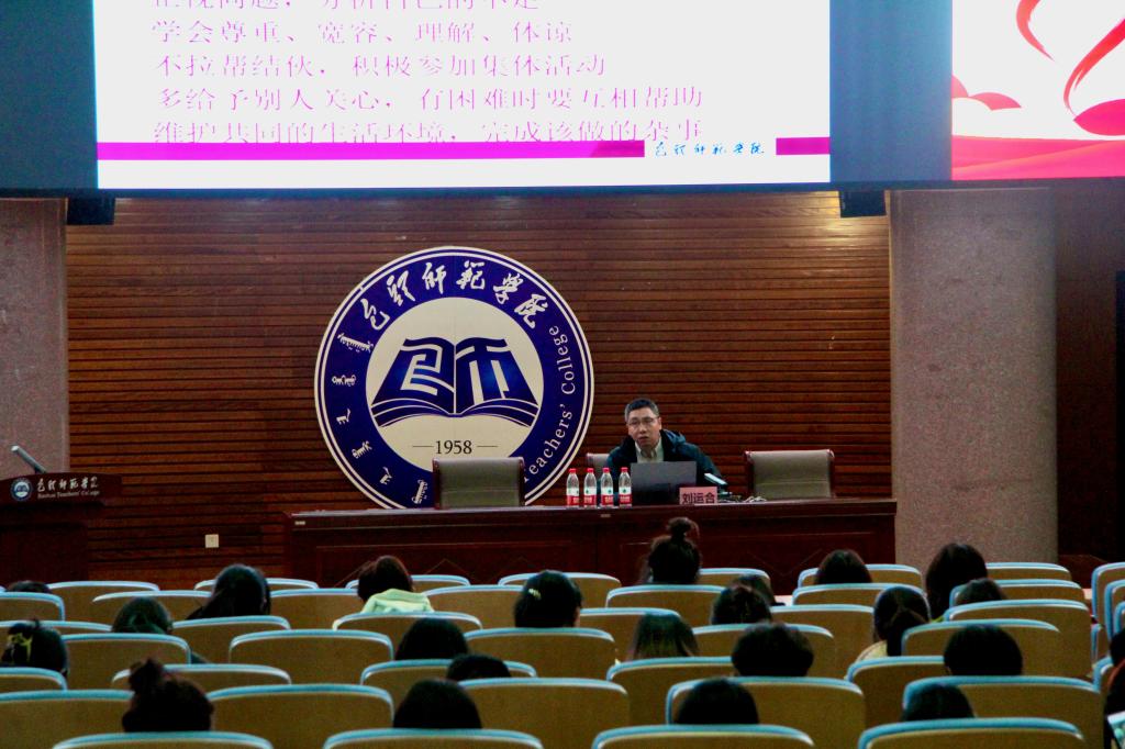 为落实学校“一站式”学生综合管理模式的要求,营造健康和谐的学生社区氛围,11月9日晚,文学院在学术报告厅举办宿舍人际关系心理健康讲座。本次讲座由教育科学学院刘运合副教授主讲,辅导员贺芬、白斯琴出席,我院2023级新生及文学院全体宿舍长参会。