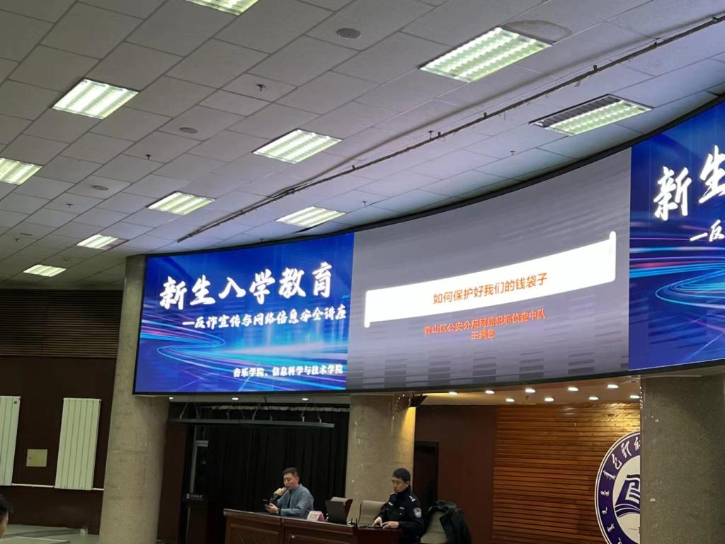 为进一步提高学生的反诈意识、营造平安和谐的校园环境,音乐学院邀请青山区公安分局网络犯罪侦查中队队长王满意警官,于11月13日为2023级新生开展反诈宣传与网络信息安全讲座。