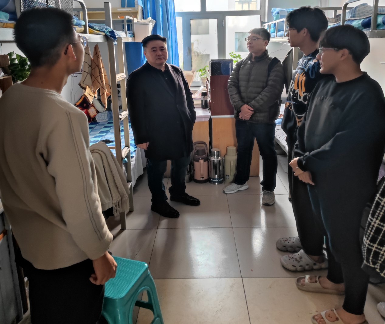 首先,刘一峰向大家介绍了我院“一站式”学生社区综合管理模式建设实施方案精神以及即将开展的一系列活动,同时希望广大同学们对学院一站式学生社区管理积极献言献策。本次座谈会目的旨在加强学院领导与学生沟通交流,耐心地听取每一位学生的在校学习、生活、校园文化活动情况、对学院学生会教育管理服务建议等。其次刘一峰副书记到学生宿舍查看学生宿舍卫生状况及安全隐患排查,对学生遇到的问题提出建议,提倡学生要养成良好的学习和生活习惯,远离网络游戏,加强体育锻炼,学会与人交往,建立和谐的人际关系,养成良好的生活习惯,共同营造积极向上的学风和舍风,要持续践行安全文明宿舍建设,遵守校规校级,树立安全底线思维,用实际行动为校园文明安全贡献力量。