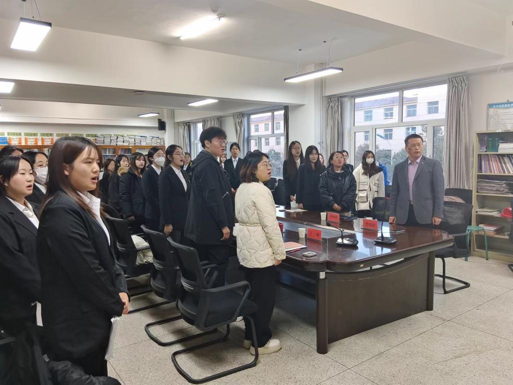 11月9日,学院在南逸夫楼334教室举行开班仪式。外国语学院党总支书记李培欣,党总支副书记丁坤,辅导员康树林、王剑以及40名青马班学员参加开班仪式。全体肃立,奏唱国歌。在庄严的国歌声中,开班仪式拉开序幕。丁坤为本期培训班开班致辞。她首先对青年骨干们为学院的付出表示感谢,并对青马班的顺利开展表示祝贺,同时对参加培训的学员提出两点希望:一是要提升政治素养。作为学生骨干要坚定理想信念,不断用党的创新理论武装头脑,坚定不移听党话、跟党走,自觉做习近平新时代中国特色社会主义思想的坚定信仰者、积极传播者和忠实践行者。二是要提升学习工作能力,以青马培训为契机,切实增强本领,做到“有所学、有所思、有所获”,起到先锋模范带头作用,引领广大青年学生共同营造良好校风、学风。