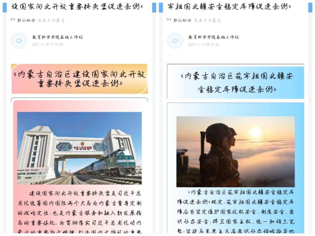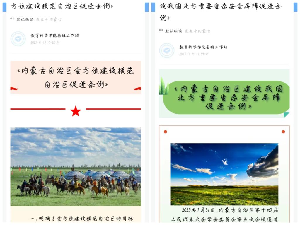 为了深入贯彻落实习近平总书记对内蒙古的重要指示精神,让同学们领会《内蒙古自治区全方位建设模范自治区促进条例》等六部促进条例精神并持续深入学习其精神实质。从11月13日起,教育科学学院开始针对自治区六部促进条例进行每日一篇新闻稿的宣传,致力于使学生深入了解并掌握此项重要条例。