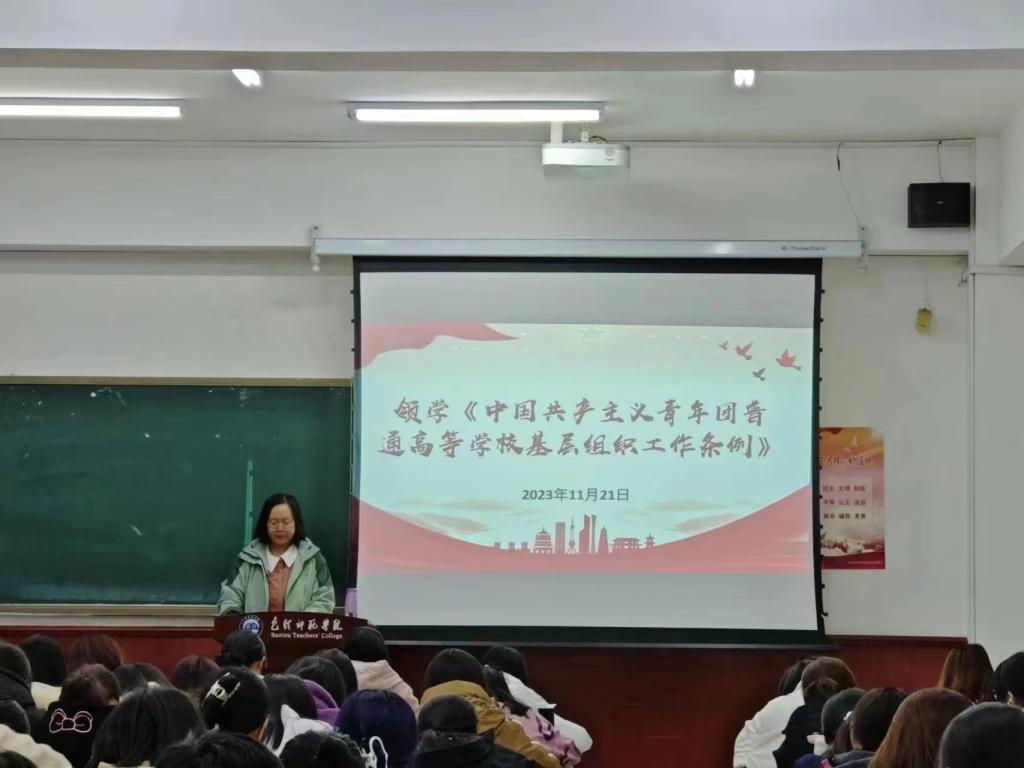 为了深入贯彻习近平新时代中国特色社会主义思想,贯彻落实习近平总书记关于青年工作的重要思想和关于教育的重要论述,加强和改进普通高等学校团的基层建设,近日,共青团中央、教育部联合印发了修订后的《中国共产主义青年团普通高等学校基层组织工作条例》。11月21日晚,教育科学学院举行第五期“青马工程”培训班专题讲座(二)——团课:领学《中国共产主义青年团普通高等学校基层组织工作条例》,此次团课由团总支书记方丽慧领学,全体学员参加。