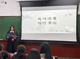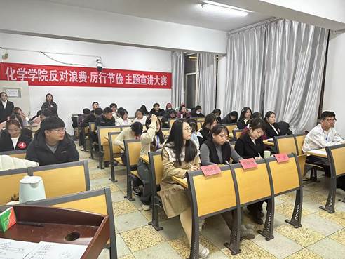 基于提高资源利用率,减少浪费,促进可持续发展,进一步减少对环境的负面影响的目标,同时培养学生们的节约意识、形成良好的生活习惯,增强学生们珍视资源的责任感。11月12日,化学学院团总支综合部和学生会文艺部共同组织了“反对浪费·厉行节约”主题宣讲大赛。学工办老师刘晓慧、李丽、周梦影作为评委出席了本次宣讲大赛。