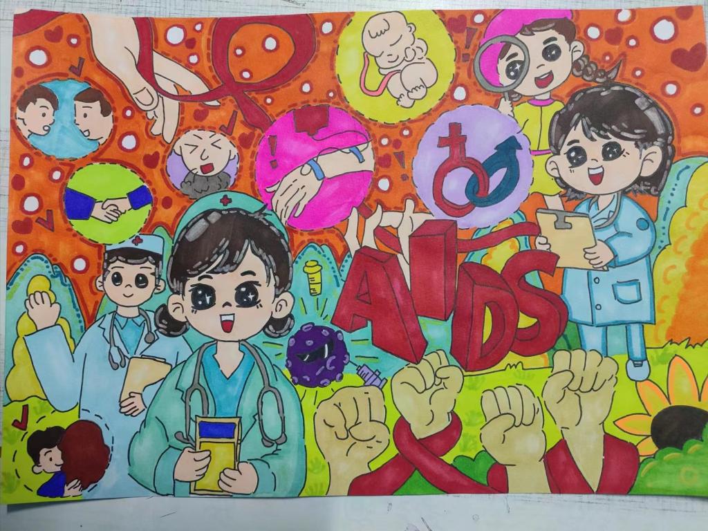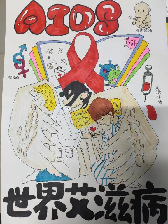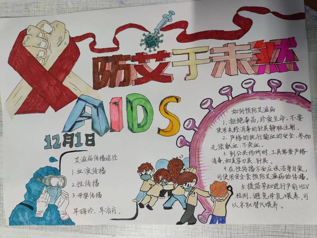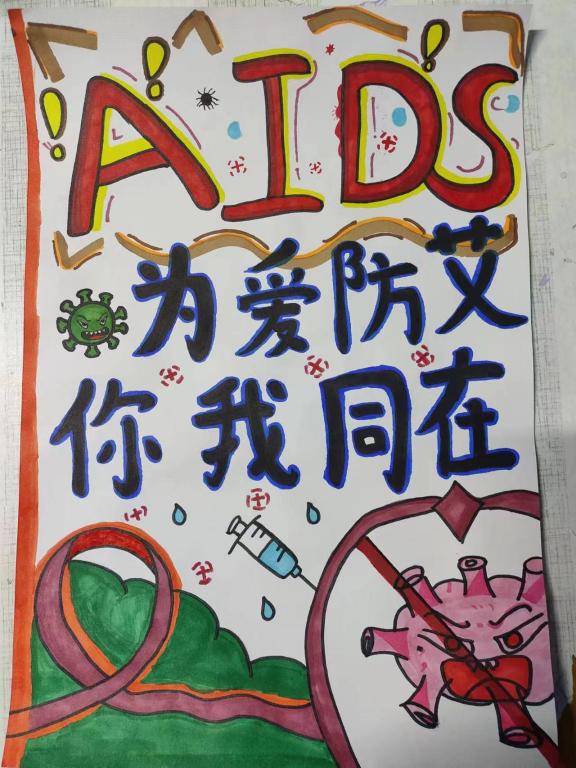通过8K大小纸张上的创作,学生不仅学到了相关知识,深刻了解了艾滋病的危害和传播途径,更明白了艾滋病防控的紧迫性以及不良行为可能带来的感染风险。这使得学生们对艾滋病的认知更加全面,进一步强调了预防艾滋病的重要性,从而在校园中促使学生形成健康的行为观念,避免不当行为可能带来的风险。(教育科学学院)