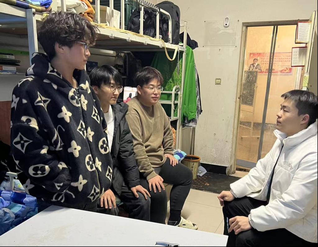学生党员们进入宿舍,通过走访,了解低年级同学们的生活情况,分享他们的学习生活经验,鼓励同学们学好专业基础知识,在专业领域有所发展、有所收获。在交流中,学生党员发现部分学生有积极向党组织靠拢的愿望与决心,但是对如何写好思想汇报等有困惑,学生党员们进行了耐心解答。