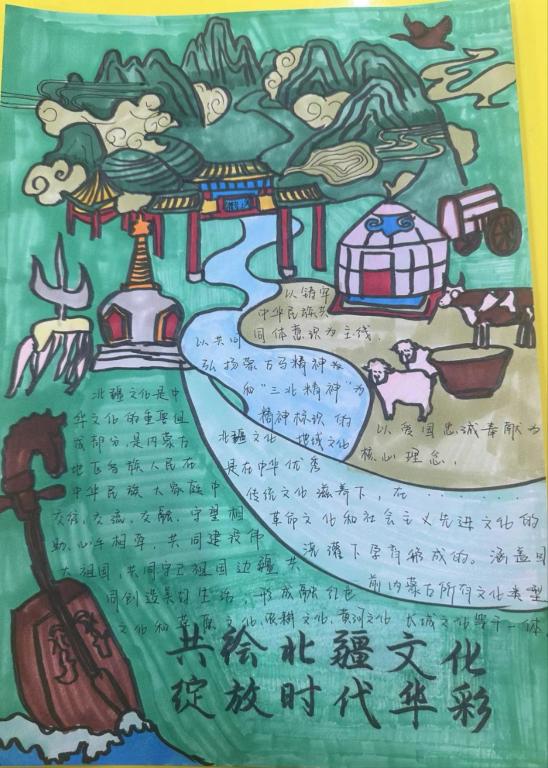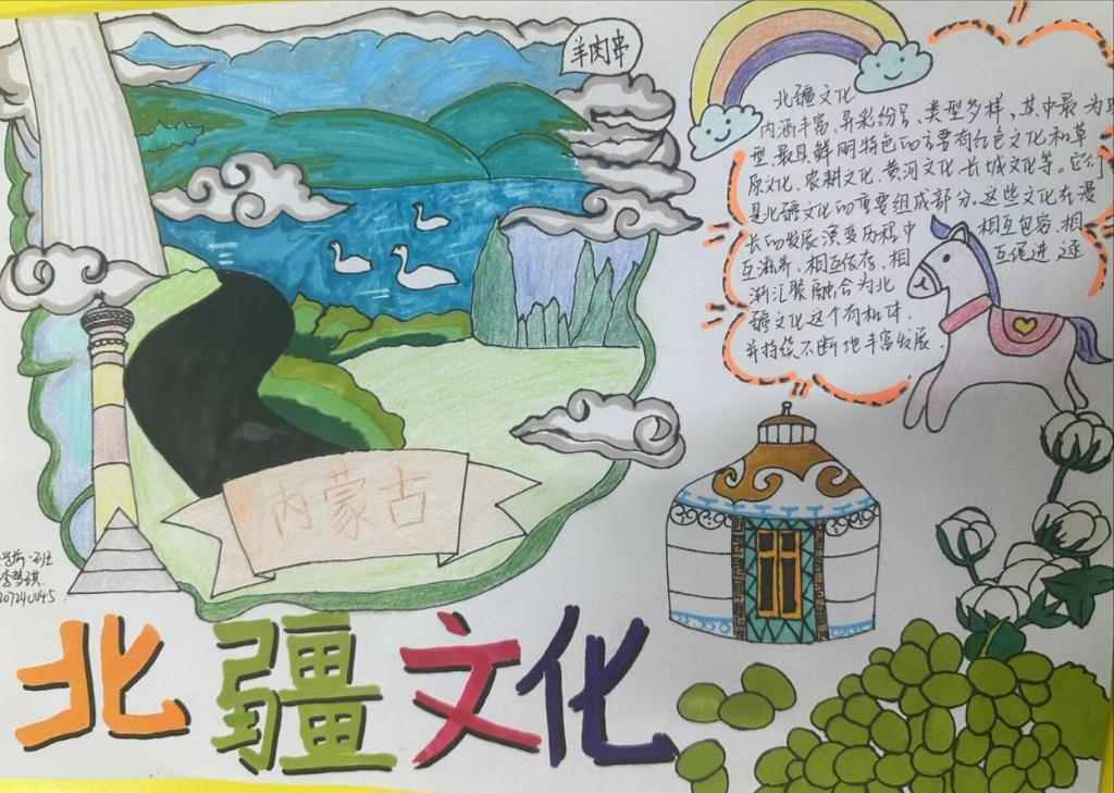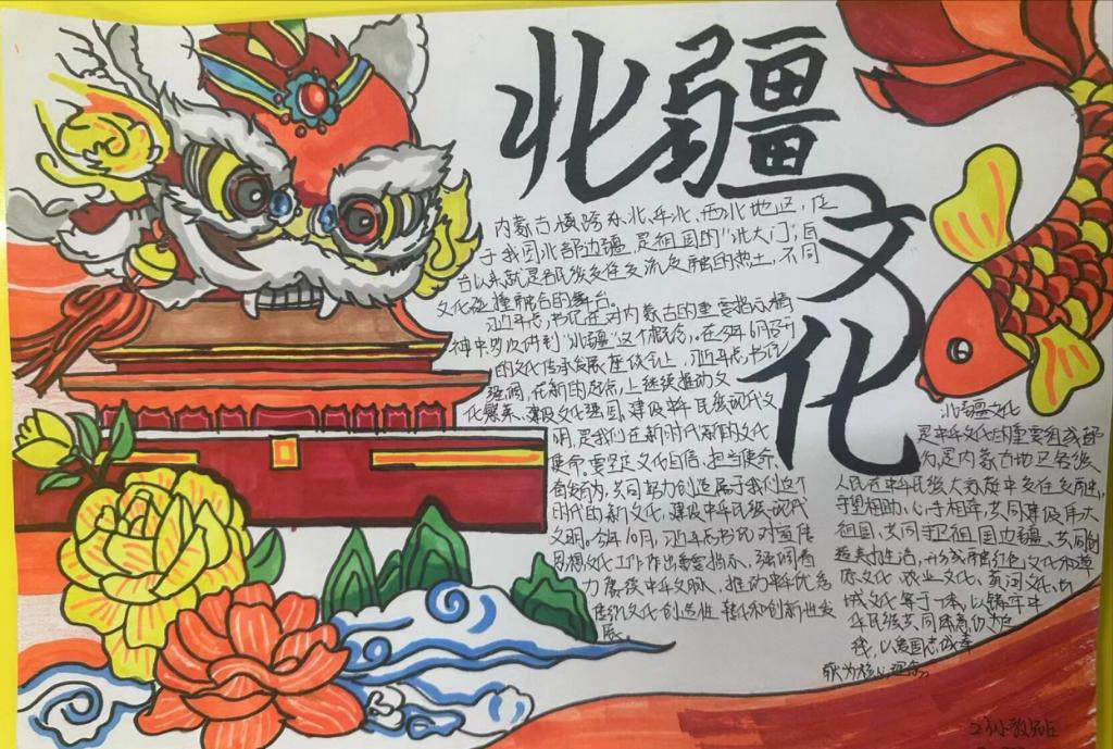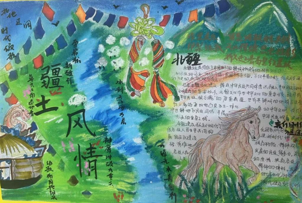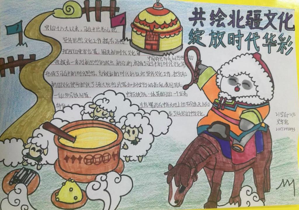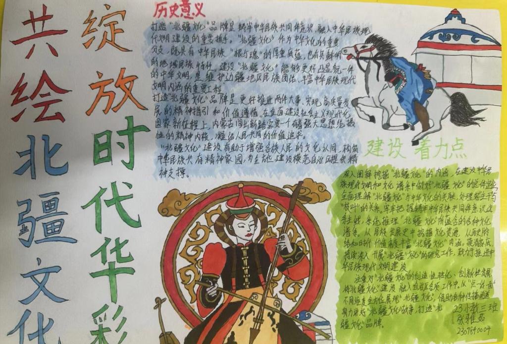 手抄报征集活动。11月28日-30日,学院举办了“共绘北疆文化,绽放时代华彩”手抄报征集活动。活动共征集作品100余份,作品布局合理、色彩鲜明、内容丰富,画面美观,书写规范,展现了同学们对于北疆文化内涵的理解,体现了同学们积极向上的精神风貌。在作品创作中,有的同学描绘出了草原辽阔无垠的风采,象征了雄浑大气、生气盎然的北疆青年的远大志向;有的同学加入了蒙古包、蒙古袍的元素,代表了历史悠远、韵意绵长的传统民族文化;还有的同学画出了吉祥结、彩旗、哈达等,寓意着美好吉祥的民族风尚。