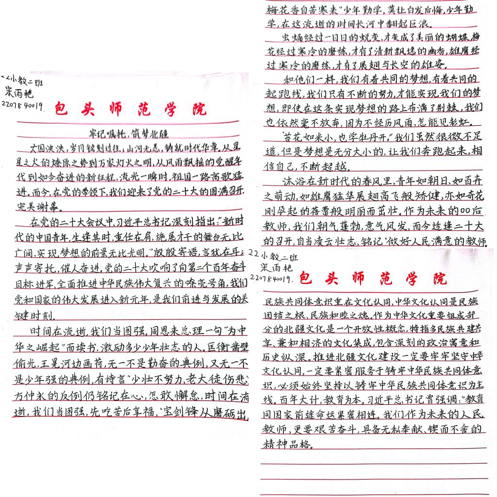 主题征文活动。11月30日-12月3日,学院举办了“牢记嘱托,筑梦北疆”主题征文活动。共征集到150余份作品,作品围绕“北疆文化”的精神内涵,共同繁荣发展的主题展开叙述。同学们在语言运用、思想表达、结构安排等方面表现出色,以生动、形象的语言使得整个文章显得流畅而富有感染力,同时以铸牢中华民族共同体意识为主线,聚焦北疆文化,抒发自己的真情实感,从不同角度书写了对伟大祖国的热爱,书写了对大美内蒙古的自豪情感。