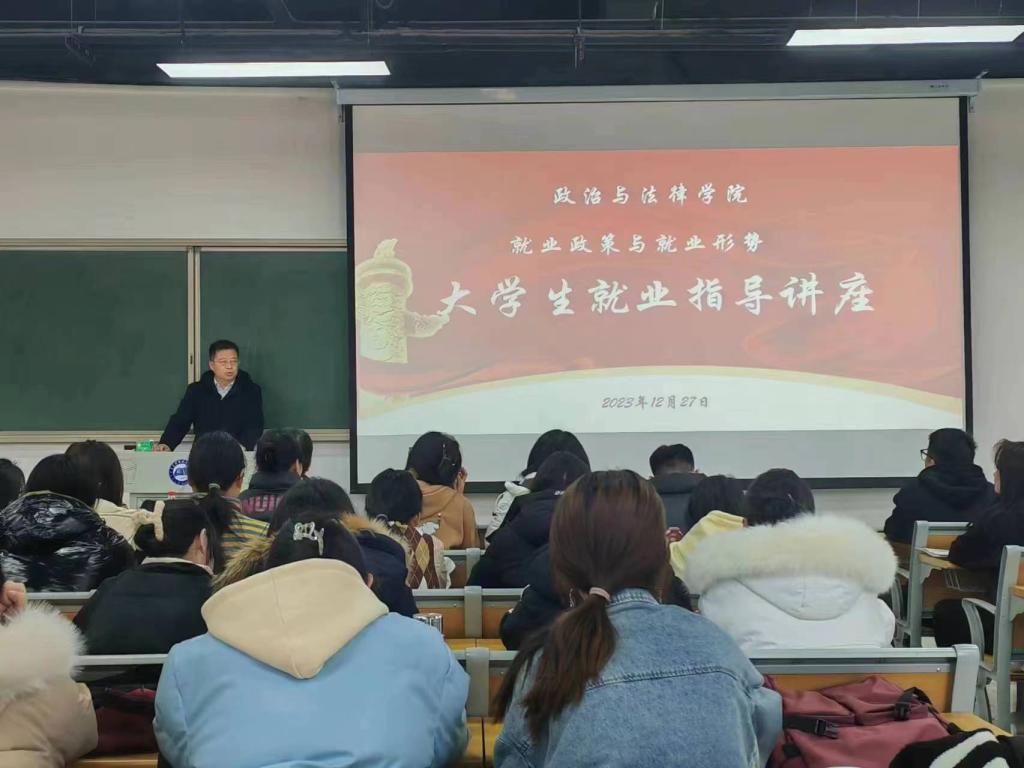 为帮助大学生充分了解就业形势,转变就业观念,掌握就业技巧、提升就业能力和竞争力,政治与法律学院于2023年12月27日下午三点在九原校区综合楼208教室开展了高校毕业生就业政策解读和就业指导讲座。本次讲座由政治与法律学院党总支副书记郭宏升主持,特邀请包头市人力资源社会保障局大学生就业指导服务中心贾勇主任和史佳钰副主任作为本次讲座的主讲人,就业工作辅导员和学院20级-22级政治学与行政学专业学生参与了本次讲座。