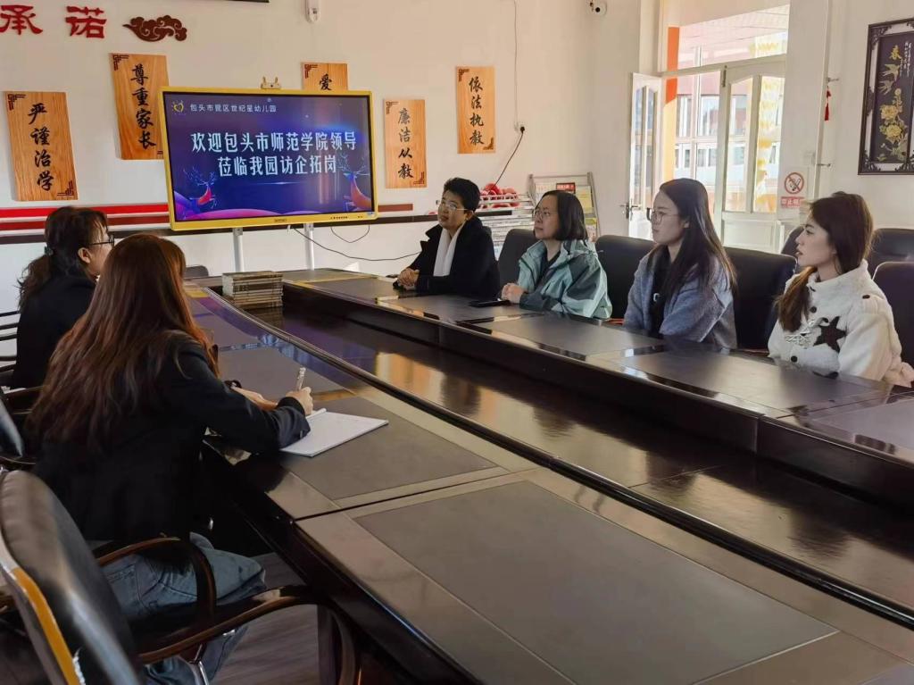 为深入落实就业优先政策,持续推进访企拓岗促就业专项行动。3月20日教育科学学院党总支书记李燕、学工办主任方丽慧及学生代表一行赴包头市世纪星幼儿园进行走访调研,与幼儿园主要负责人就园所基本情况、师资待遇、薪酬福利、教师晋升渠道等进行了沟通交流,并就幼儿园2024年招聘岗位数和招聘会安排等事宜进行了协商。