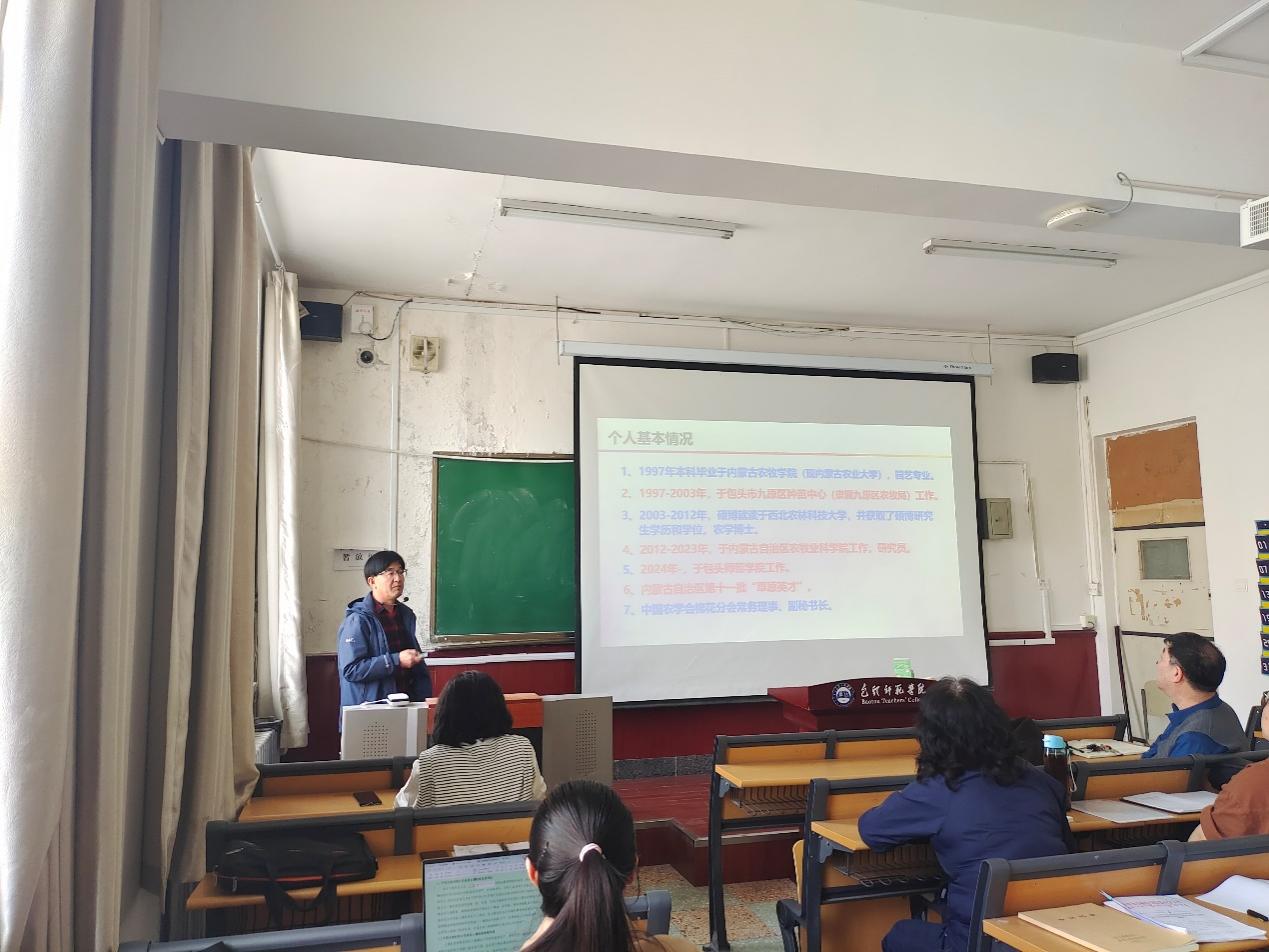 咸丰老师的讲座以“内蒙古棉花产业发展与研究进展”为题,首先从棉花的用途和地位、棉花的传播与发展、棉花的特性、全球棉花的分布与发展进行了深入浅出的讲解,让在座老师对棉花这种“衣被天下”的作物有了全面的了解。然后就国内棉花的研究现状、内蒙古棉花产业发展、内蒙古棉花研究进展、内蒙古棉花存在问题进行了深入分析。讲座最后,咸丰老师还就棉花研究的相关问题与老师们进行探讨交流。