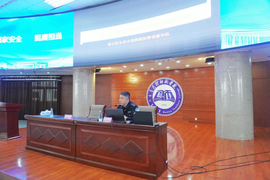 安全乃个人之基本所需,亦为国家安定发展之基石。4月11日下午,为深入贯彻落实总体国家安全观,培养和增强师生国家安全的责任感和使命感,在第九个全民国家安全教育日来临之际,4月11日历史文化学院特举办了一场有关国家安全教育——反邪教与反诈知识的讲座。讲座由历史文化学院党总支副书记罗鹏主持,青山区公安分局政保大队民警赵晨阳、青山分局刑侦大队反诈中心主任王满意主讲,莅临本次讲座的有校团委书记丁坤,学生工作部副部长刘国庆,保卫处副处长黄琴琴,历史文化学院党总支书记张迎峰,历史文化学院辅导员包艳萍以及青山校区各学院学生代表。