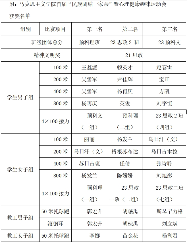 本次运动会强健了师生的体魄,营造了健康、文明、阳光的校园氛围,增强了马克思主义学院各民族师生的团结、友爱,促进了师生的身心健康,进一步推动了校园文化建设,为在校运会上取得更好成绩奠定了基础。(马克思主义学院)