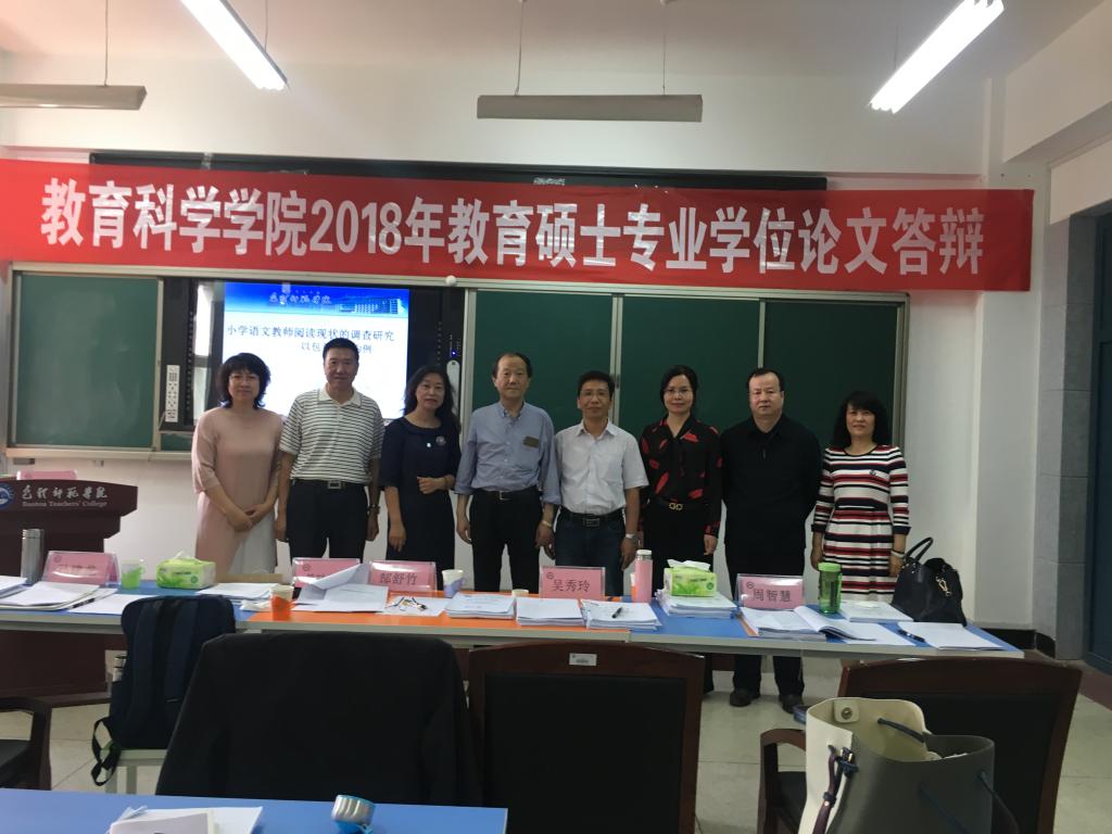 5月25日,教育科学学院举行了2018届教育硕士研究生专业学位论文答辩会。本次答辩委员会主席由首都师范大学初等教育学院副院长郜舒竹教授担任,答辩委员为首都师范大学初等教育学院孙建龙副院长、包头市教育督导评估中心吴秀玲主任、教育科学学院院长郝红英教授以及包头师范学院科技处副处长周智慧教授。教育科学学院副院长李芳教授负责答辩工作的组织与协调,王婵娟老师担任答辩委员会秘书。我院2018届教育硕士专业学位硕士研究生祁欢、景桥、高学玲、于洪健、马凤洁、白璐、陈琛、石晓委、李春凤、李树奇、李佳丽十一名同学依次进行了答辩,2017级全体在读教育硕士专业学位研究生聆听了答辩会。