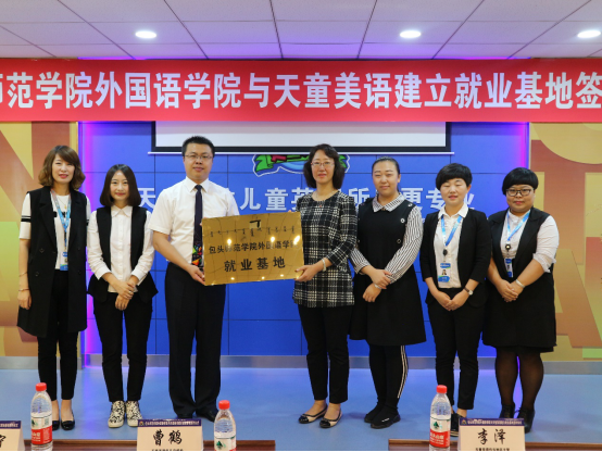 签约仪式上,潘若芸首先代表外国语学院介绍了历届毕业生在就业中面对的困境和建立就业基地的初衷。李泽校长代表天童美语介绍了学校的基本情况和拟为大学生提供的就业实践内容。之后,外国语学院2015届毕业生、特级讲师高鑫详细讲述了她在天童美语的成长之路。最后,潘院长为天童美语授牌,正式签订该校为就业基地。