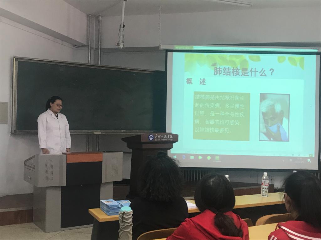 为加强学校结核病防治工作,强化结核病防治知识宣传,4月10日下午在博学楼东104教室,教育科学学院与校医院联合举办了结核病防治知识讲座,校医院李敏医生作了题为《遏制结核 共享健康》的专题讲座,校医院副院长王彦超、医生高智慧,教育科学学院党总支书记张岫峰、辅导员阿如罕出席讲座,教育科学学院各年级各专业共计七个班110余名学生代表聆听了讲座。