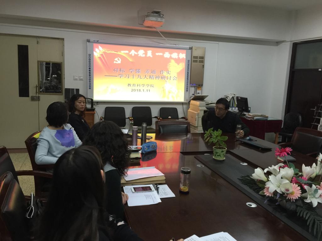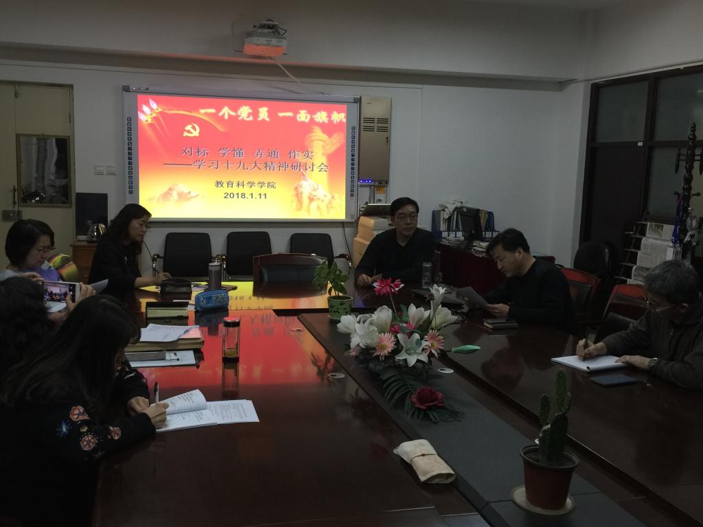 为深入学习贯彻党的十九大精神,认真学习领会习近平新时代中国特色社会主义思想,按照校党委学习贯彻党的十九大精神专题培训的安排,在前期组织学习和自学的基础上,1月11日下午,教育科学学院组织召开“学习十九大精神——对标学懂弄通做实”专题学习研讨会,领导班子成员张岫峰、郝红英、袁秀利、李芳和五位党支部书记参加了研讨会,会议由党总支书记张岫峰主持。