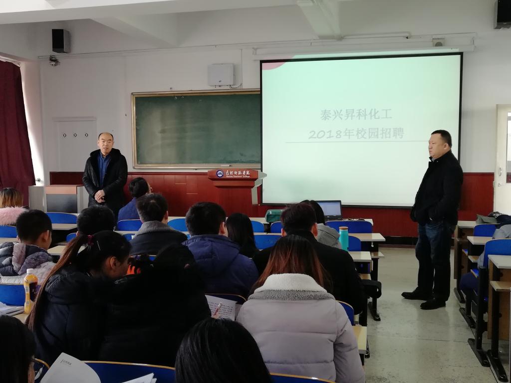 12月26日上午,化学学院举办了江苏泰兴昇科化工有限公司专场招聘会。化学学院领导、团学辅导员及百余名毕业生参加了招聘宣讲会。