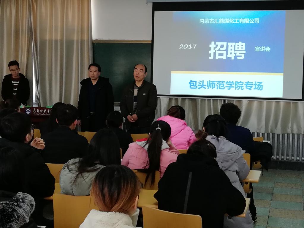化学学院、物理科学与技术学院100余名毕业生参加了招聘宣讲会。公司工作人员播放了内蒙古汇能煤化工有限公司的宣传短片,以PPT的形式从发展历史、公司理念、生产状况、晋升机制、福利待遇、人员需求等方面做了重点介绍,并对学生提出的问题一一做了详细的解答。