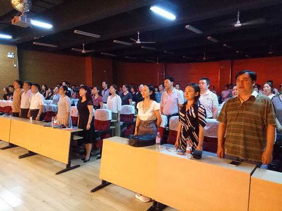 7月1日晚,音乐学院、资源与环境学院在音乐学院博艺厅联合举办“庆祝建党96周年、弘扬中国传统文化”特色党日活动。本次活动由“高唱国歌”、“重温入党誓词”、“观赏中国传统音乐教学团队《中国民族民间音乐》重点课程教学成果展演”三个部分组成。活动由音乐学院党总支书记李红梅主持。