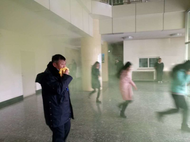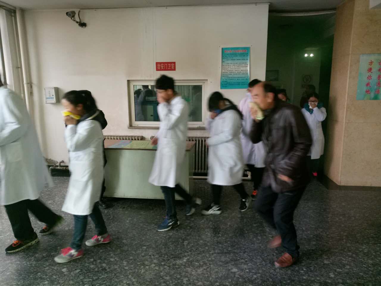 演练开始之前,由保卫处老师对同学们进行了关于如何安全撤离的指导和教育。接下来,同学们进入模拟事发地点。放出烟雾弹,警报声响起,撤离行动正式展开。学生们在各楼层老师和校卫队成员的引导下,用事先准备好的湿毛巾捂住口鼻,低姿,沿着安全疏散通道快速有序的撤离到安全地带。最后,各演练小组组长迅速清点人数,向老师汇报。老师对本次演练进行了总结,同时提醒了同学们一些宿舍安全用电的相关事宜。