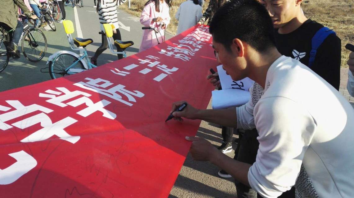 活动伊始,学生有秩序的按班级排队。随后,主持人对路线和要求说明后宣布健步行活动正式开始,大家兴致高昂地结伴出发。三位老师也积极参与到比赛其中,与同学们一路上有说有笑,一路上洒满了欢歌笑语。完成全程后,每位同学都在宣传条幅上留下了自己的签名,为本次活动画上了圆满的句号。
