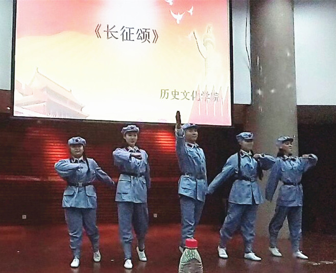 本次纪念红军长征胜利80周年诵读比赛,是历史文化学院以学院指导的中华文明研习社为主要承办单位组织开展的“一院一品”特色活动,同时也是学院学生党建工作站结合专业开展爱国主义教育、以党建带团建的活动内容之一,活动在注重纪念性、知识性的同时,通过学生党员、入党积极分子和学生干部的积极组织带动全体同学踊跃参与本次活动,达到宣传、颂扬和传承长征精神的良好效果。(历史文化学院)
