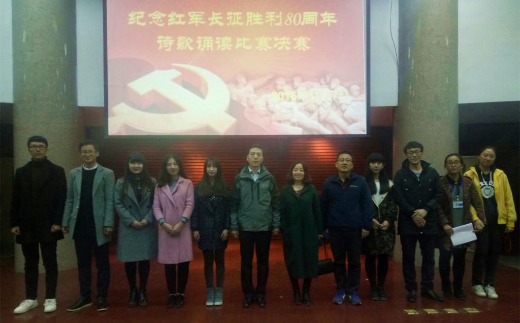 11月7日,由历史文化学院举办的“一院一品”之纪念红军长征胜利80周年诗歌诵读比赛决赛在学术报告厅举行。经过初赛脱颖而出的化学学院、体育学院、外国语学院、历史文化学院、文学院和资源与环境学院6支代表队进行了最后的角逐。