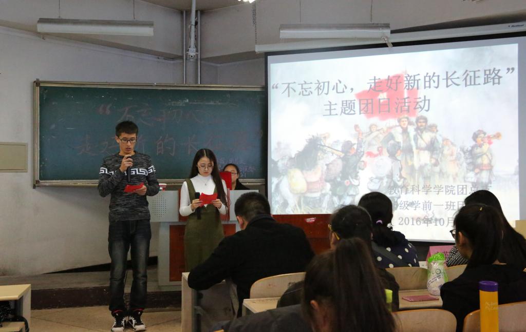 10月21日下午,为纪念中国红军长征胜利80年,本团支部开展了以“不忘初心,走好新的长征路”为主题的团日活动,特邀请校团委“驻校蹲班”指导老师刘国庆及教育科学学院团总支书记方丽慧老师深入活动现场观摩指导。活动开始后,同学们用饱满的热情,通过舞蹈、歌曲、朗诵,相声、小品等形式,讴歌伟大的长征精神,表达了对中国共产党人和人民军队的敬佩之情以及响应以习近平总书记的对青年的期望和号召,永远跟党走,“不忘初心,走好新的长征路!”的坚定信念和决心。 (教育科学学院)