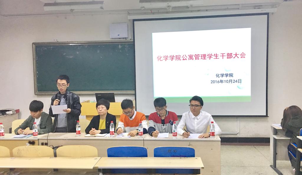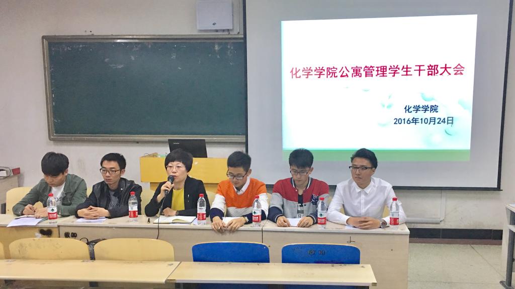 10月24日晚,化学学院在博学楼500教室召开了化学学院公寓宿舍管理学生干部大会。老师有学院党总支副书记,副院长冯丽老师,团总支书记、学工办主任韩泽红老师出席了会议,学生会主席团成员和各班级班长、团支书、各宿舍舍长参加了会议。