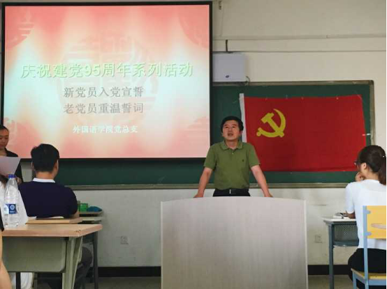 在中国共产党95周年华诞来临之际,6月28日晚,外国语学院在新逸夫楼举办了庄严而隆重的“新党员入党宣誓,老党员重温誓词”活动。学院党总支书记吴建钢、学生第一党支部书记张宝龙、学生第二党支部书记姜雪出席了此次活动,参加此次活动的还有我院老党员、本年度发展的新党员和入党积极分子。