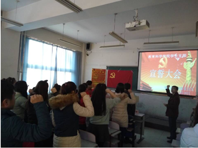 12月18日下午,教育科学学院学生党支部举行了入党宣誓大会。学院党总支副书记袁秀利,党总支委员兼学生一支部书记樊毓霖,党总支委员兼学生二支部书记方丽慧及17名新发展的预备党员参加了大会。