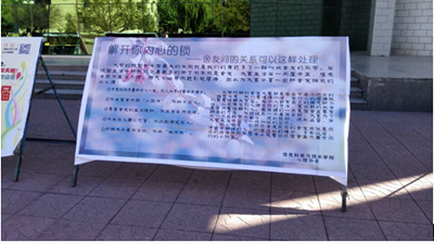 为进一步加强大学生心理健康教育工作,宣传普及心理健康知识,信息学院在 “10.10”心理健康宣传月到来之际组织开展了大学生心理健康宣传活动。本次宣传教育以“戒除网瘾与舍友融洽相处”为主题,以宣传自我心理调节和解决心理困惑为目的。活动以制作心理健康知识展板的方式进行宣传。