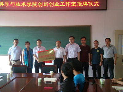 “创新创业工作室”是物理学院与创业教育学院的合作项目,仪式开始首先由张东虎老师发表讲话,他对物理学院科技创新协会给予充分肯定。随后由校领导李海丰巡视授牌,物理学院院长赵建军代表物理学院接牌。授牌后校领导李海丰发表讲话,以路甬祥的《创新的启示》为例,讲述科学大师和创新奇才的重大发现与发明创造、科学技术的历史进程与未来发展,列举了创新模范,启发同学们对创新与发展进行深入思考,培养自己的创新意识。物理学院赵建军院长表示学院将对创新创业工作室给予大力的支持。最后,科技创新协会负责人史鑫凯同学对科技创新协会自2007年来的各项成果及获得的奖项进行介绍,并对工作室未来发展规划进行说明。