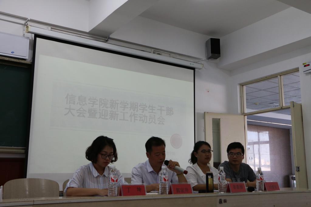 9月9日下午,信息科学与技术学院在博学楼400教室召开了新一届学生干部大会暨迎新工作动员会。信息学院副书记副院长郭宏升、学工办主任丁坤、辅导员姜嘉丽、刘爱军及全体学生干部、各班班委会、团支部成员参加了会议。会议由姜嘉丽老师主持。