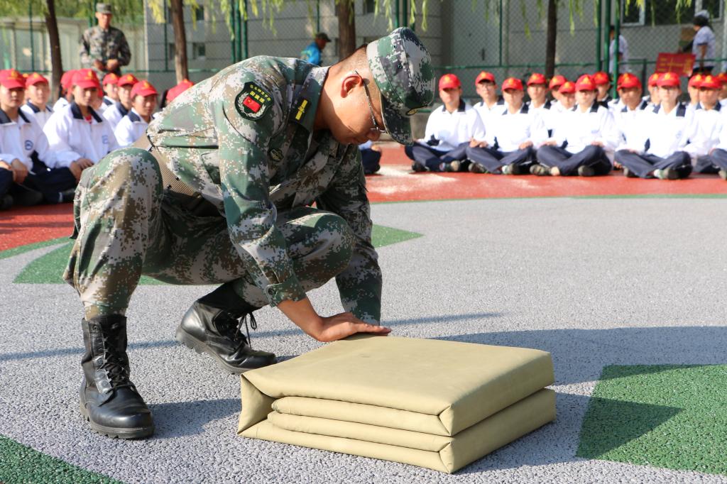 三十一连教官麻宇鹏为新生进行内务整理训练和展示,他为学生讲解了叠“豆腐块儿”被子的一些技巧与要点。身为退伍军人的麻宇鹏,他动作熟练、讲解到位,随着演示的结束,一个方方正正的“豆腐块”成型了,新生中响起了热烈的掌声。