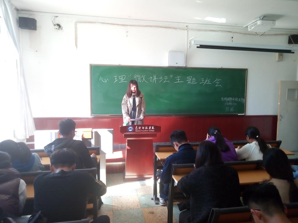 为加强大学生的心理素质教育,保证大学生心理健康发展,生物科学与技术学院于10月16日下午,在齐志楼404、405、406教室同时举办了“心理微讲坛”主题班会。