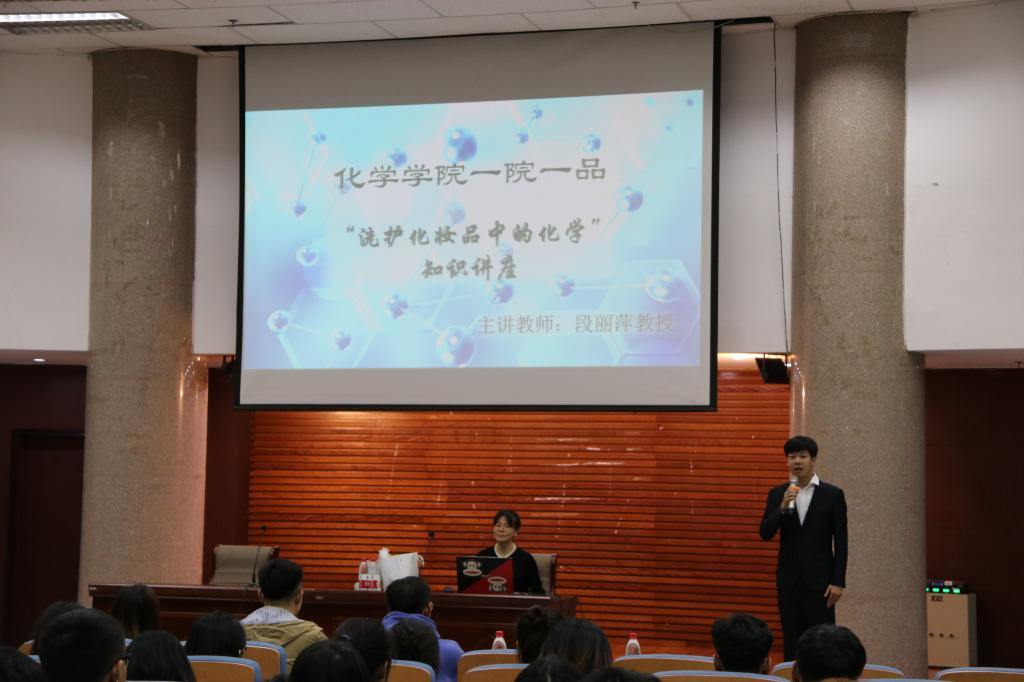 为了加强学生对化妆品中的化学成分的认识与了解,化学学院于10月24日晚上在学术报告厅举办一院一品之“洗护化妆品中的化学”知识讲座,化学学院近400名学生聆听了此次讲座。
