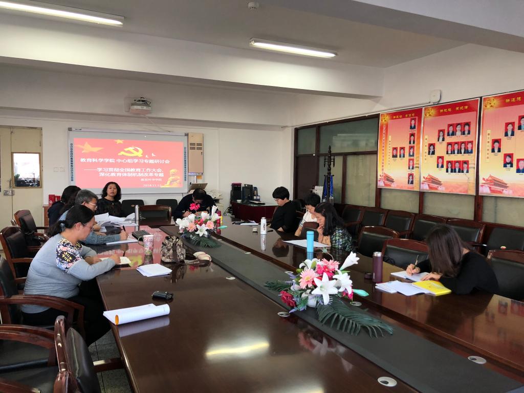 11月12日下午,教育科学学院召开“学习全国教育工作会议精神”中心组专题研讨会,会议由党总支书记张岫峰主持。会议结合学习贯彻习近平总书记在全国教育工作会议上的讲话精神和《关于深化教育体制机制改革的意见》,结合本学院教育工作和自身工作实际,围绕“努力构建德智体美劳全面培养的教育体系,形成更高水平的人才培养体系”开展研讨,10位中心组成员参加会议,其中五位中心组成员进行了发言交流。