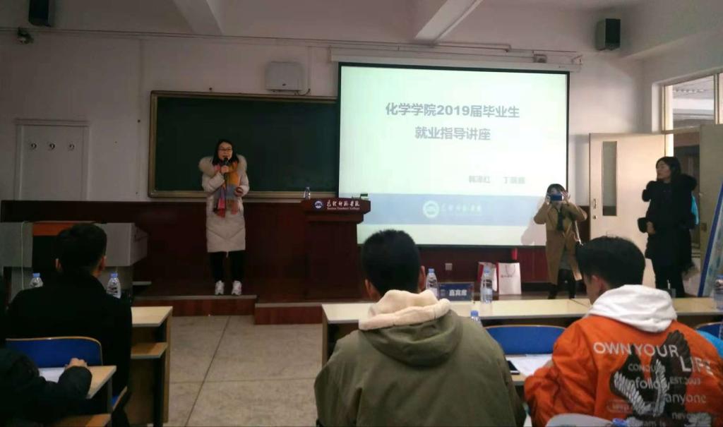 11月16日上午,化学学院在博学楼600举办了2019届毕业生就业指导讲座。讲座由化学学院辅导员丁瑞丽主讲,化学学院2019届毕业生共计130余名参加了此次讲座。
