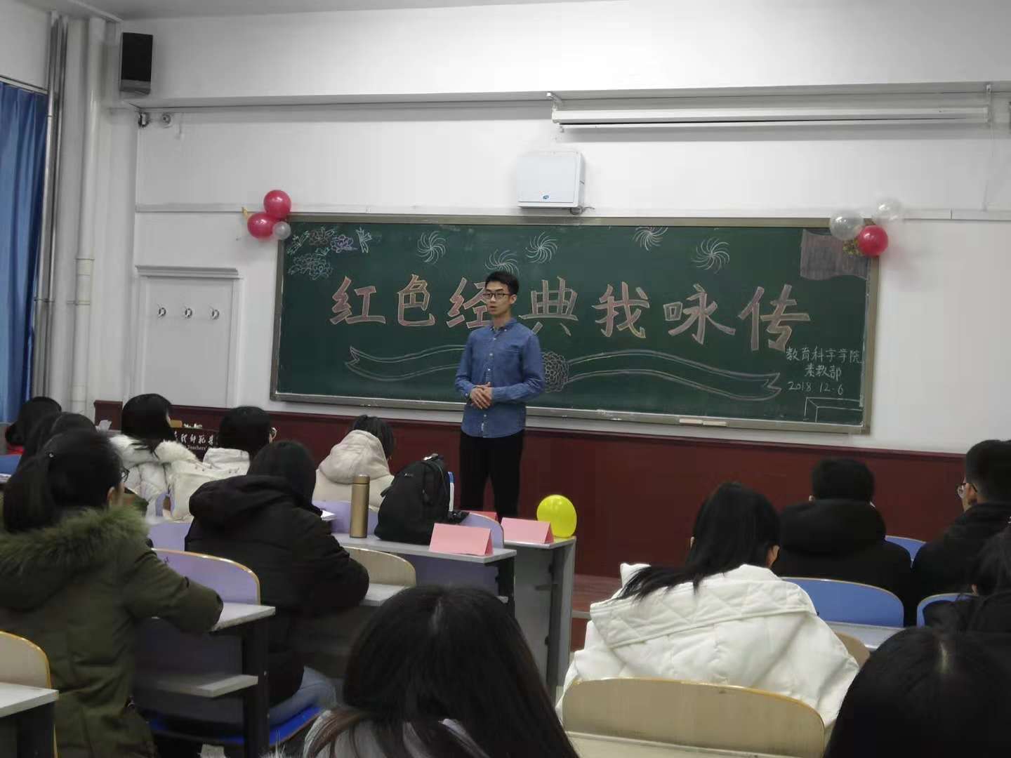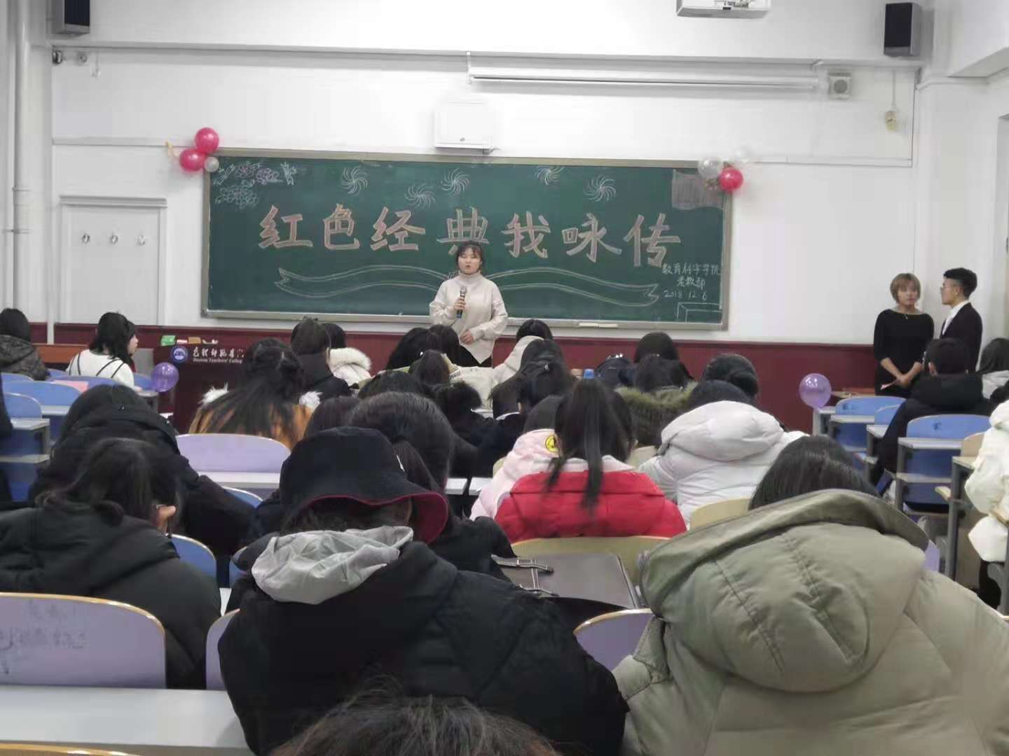 为宣传爱国主义教育,弘扬优秀传统文化,创建良好的校园文化氛围,增强学生的文化底蕴,加强对优秀中华诗词的了解与学习,同时也为学校推报优秀学生参加全区高校“中华优秀经典诗词诵读活动”,12月6日,教育科学学院学生会素教部举办了“我的肩膀——能挑多重的担子”系列活动之“红色经典我咏传”诵读大赛。