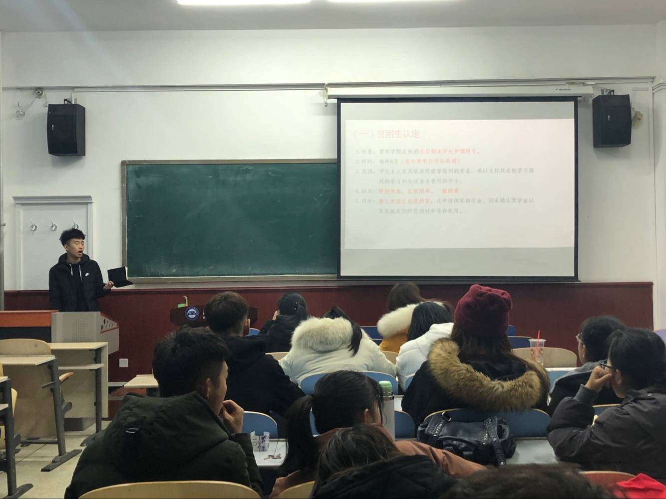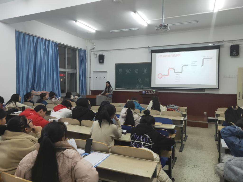 12月12日,宣讲组成员分别到各班面向2018级全体新展开了资助政策宣讲教育工作。宣讲内容从家庭经济困难学生认定工作、国家奖助学金评审要求、社会资助、评奖评优以及义工服务等几个方面,讲解了国家对大学生的资助形式,强调了审核流程及申请资助递交材料的具体要求,同时为同学们详细介绍了我校包括“奖、助、勤”在内的一系列资助政策体系。在“诚信感恩”部分重点强调了义工服务的重要意义,鼓励大家多多实践以感恩社会。